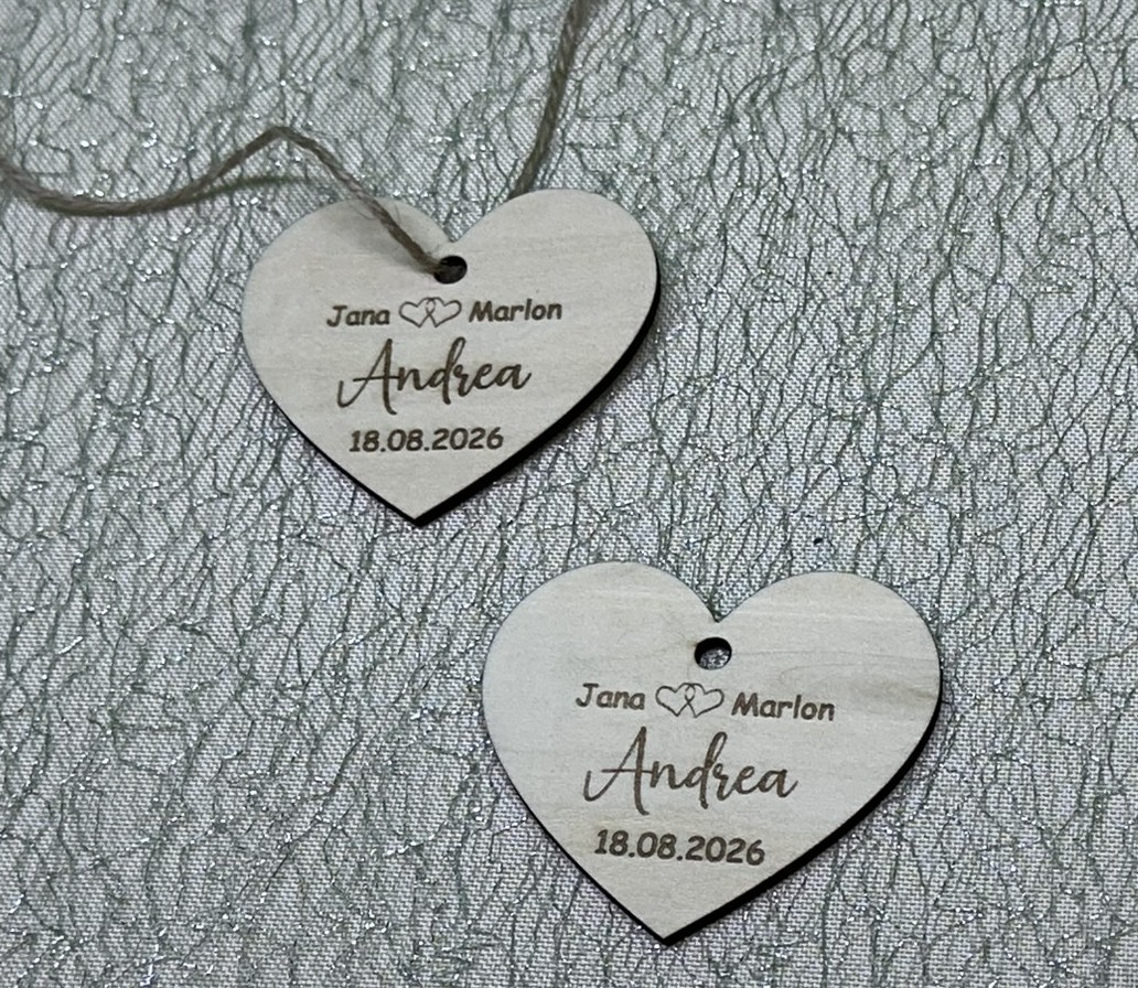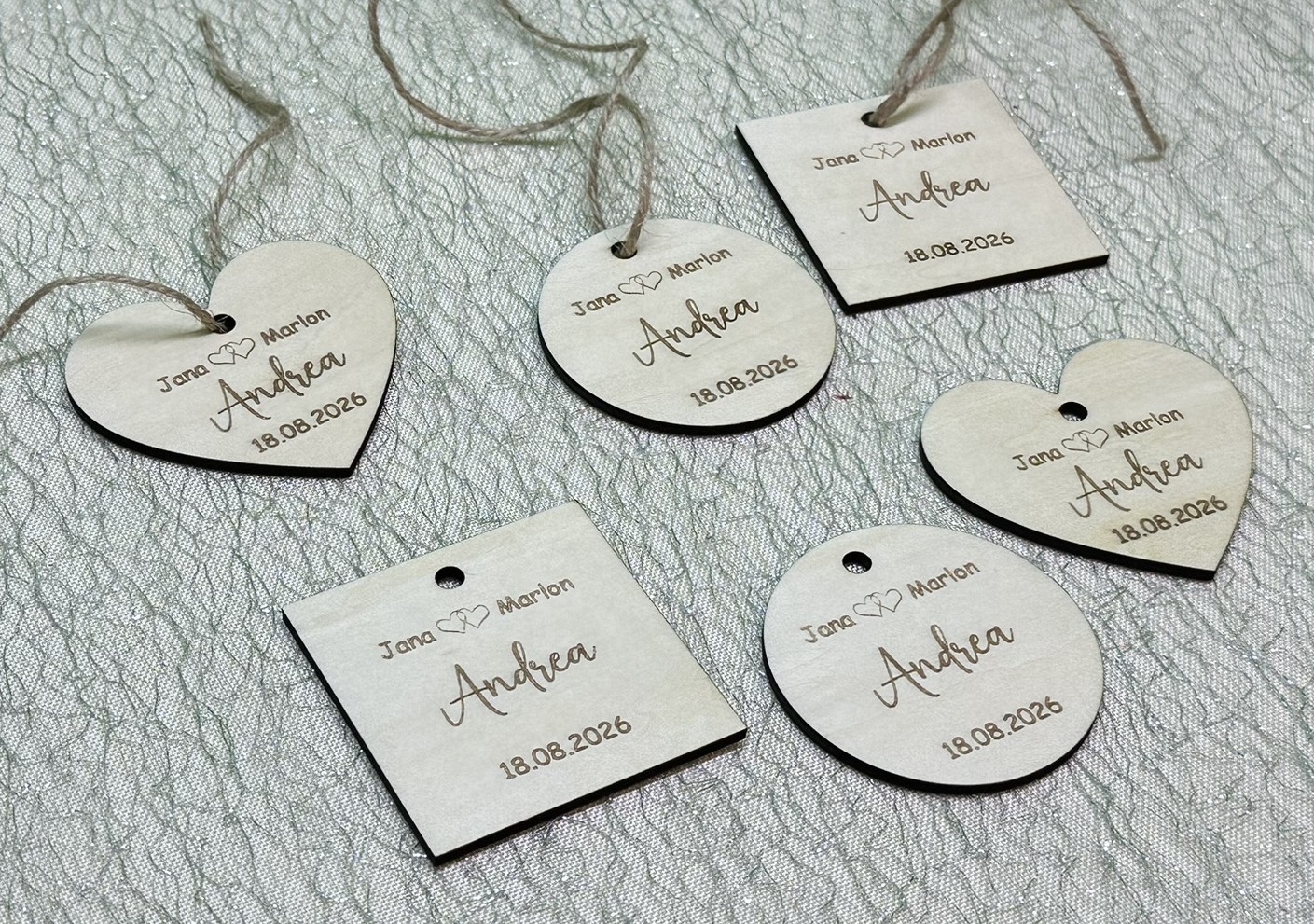 Die Schilder werden mittels Laser mit Grauvr versehen. Dort stehen die Namen des Brautpaares, das Hochzeitsdatum und der Name des Gastes drauf.