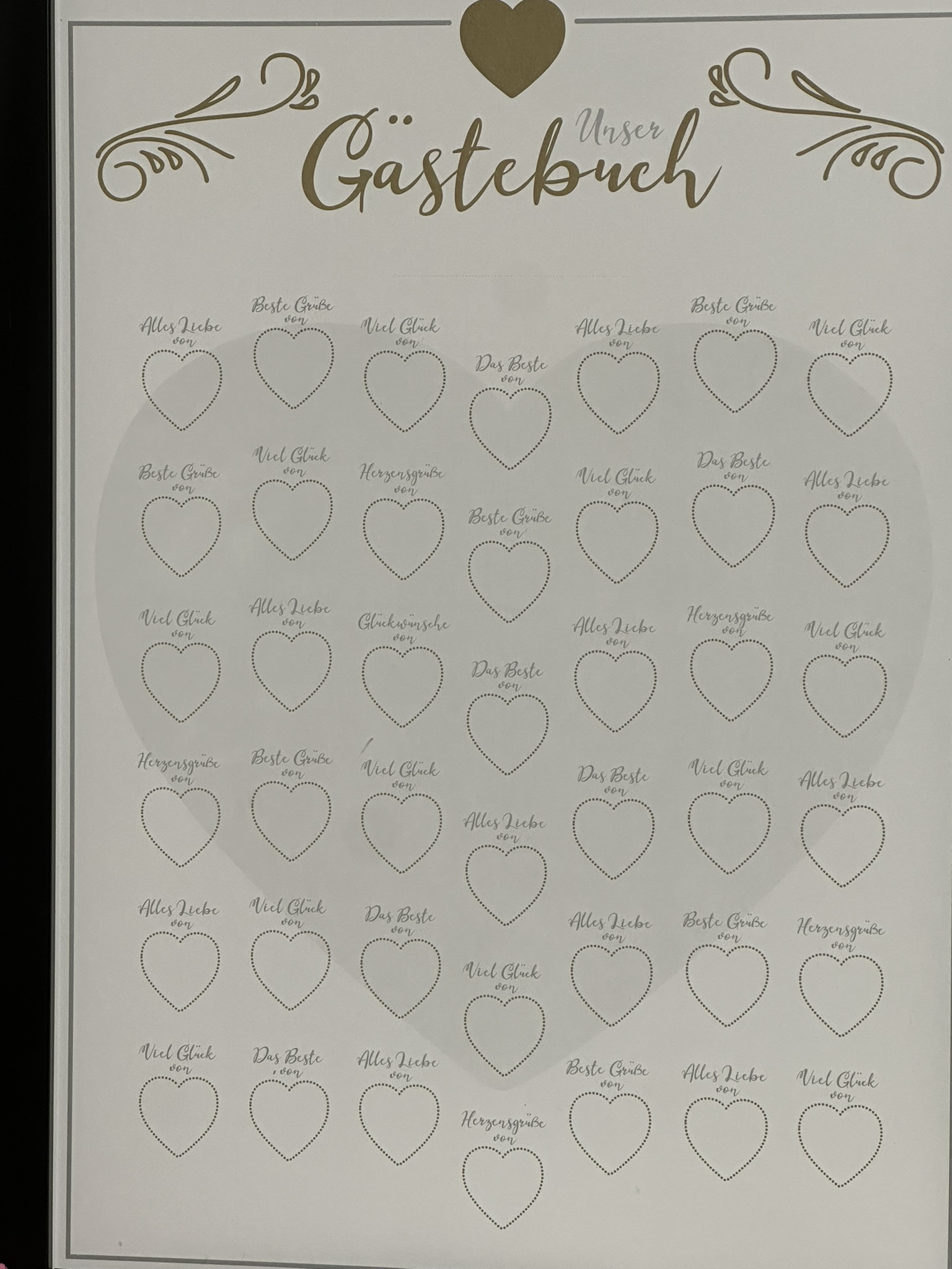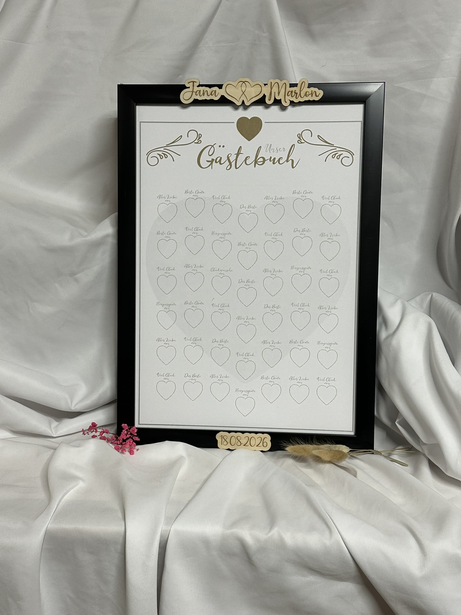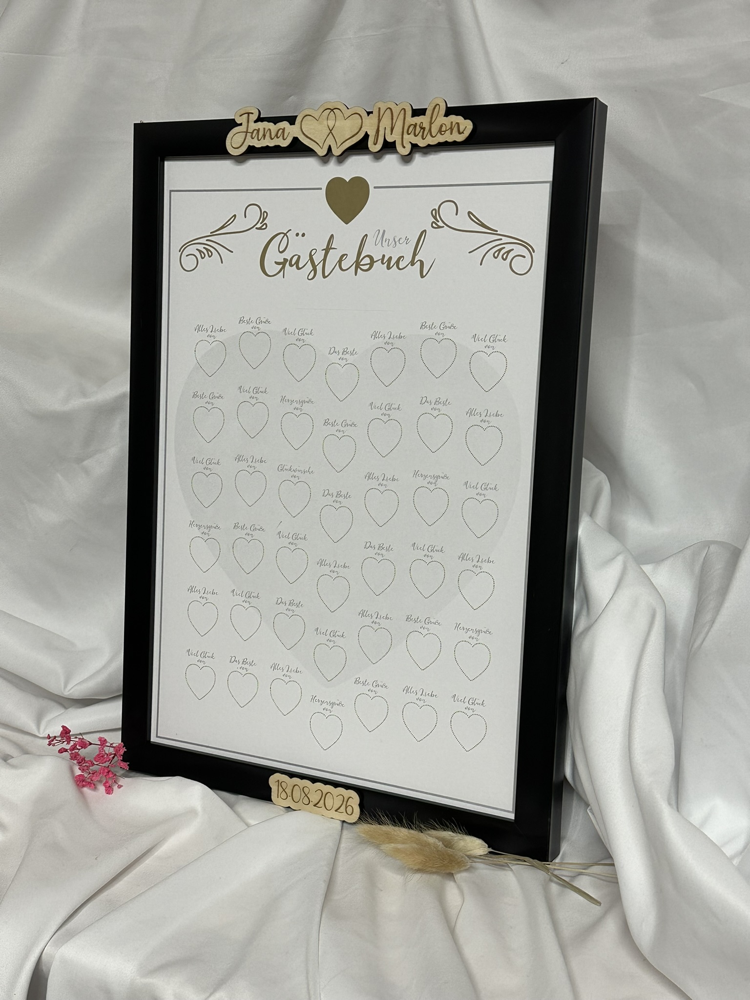 Gästebuch mit schwarzem Rahmen und Holzeinlage, mit Glitzerdetails. Gestaltet um Fingerabdrücke und Namen der Gäste festzuhalten, mit Platz für 42 Herzen. Inklusive passendem Stift und goldfarbenem Stempelkissen. Mit Aufhängung auf der Rückseite als bleibende Erinnerung.
