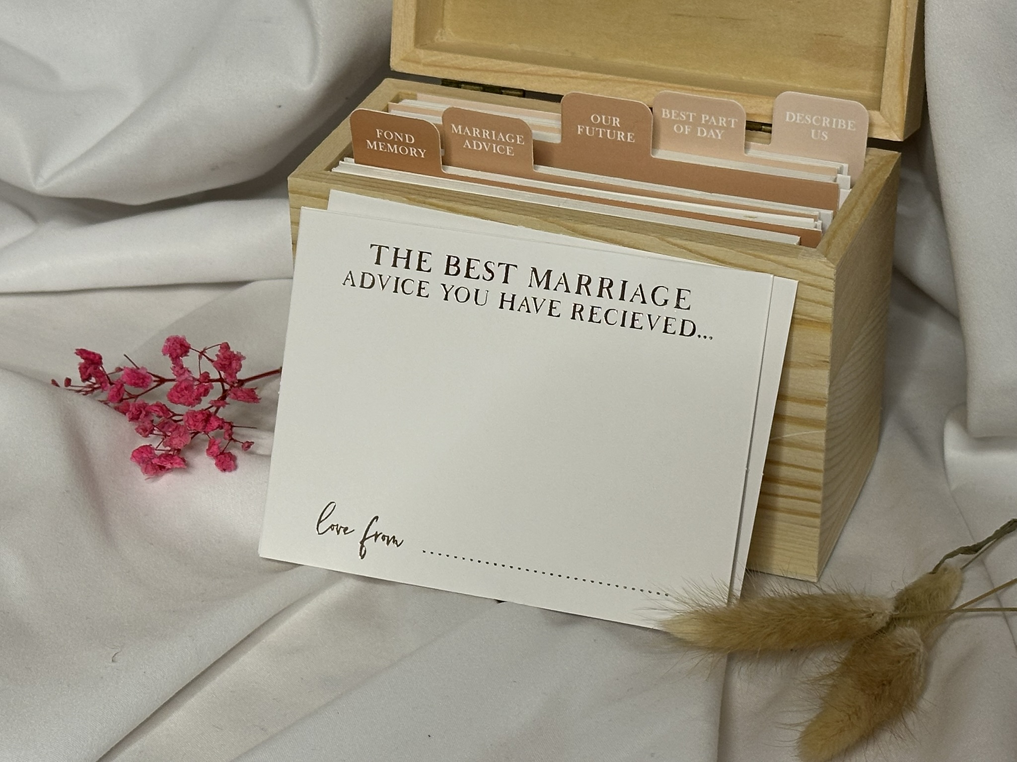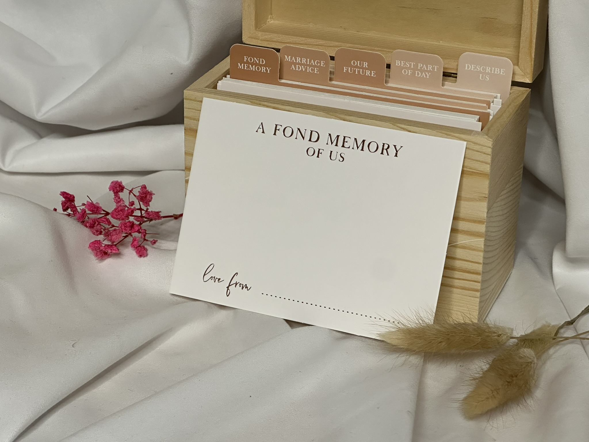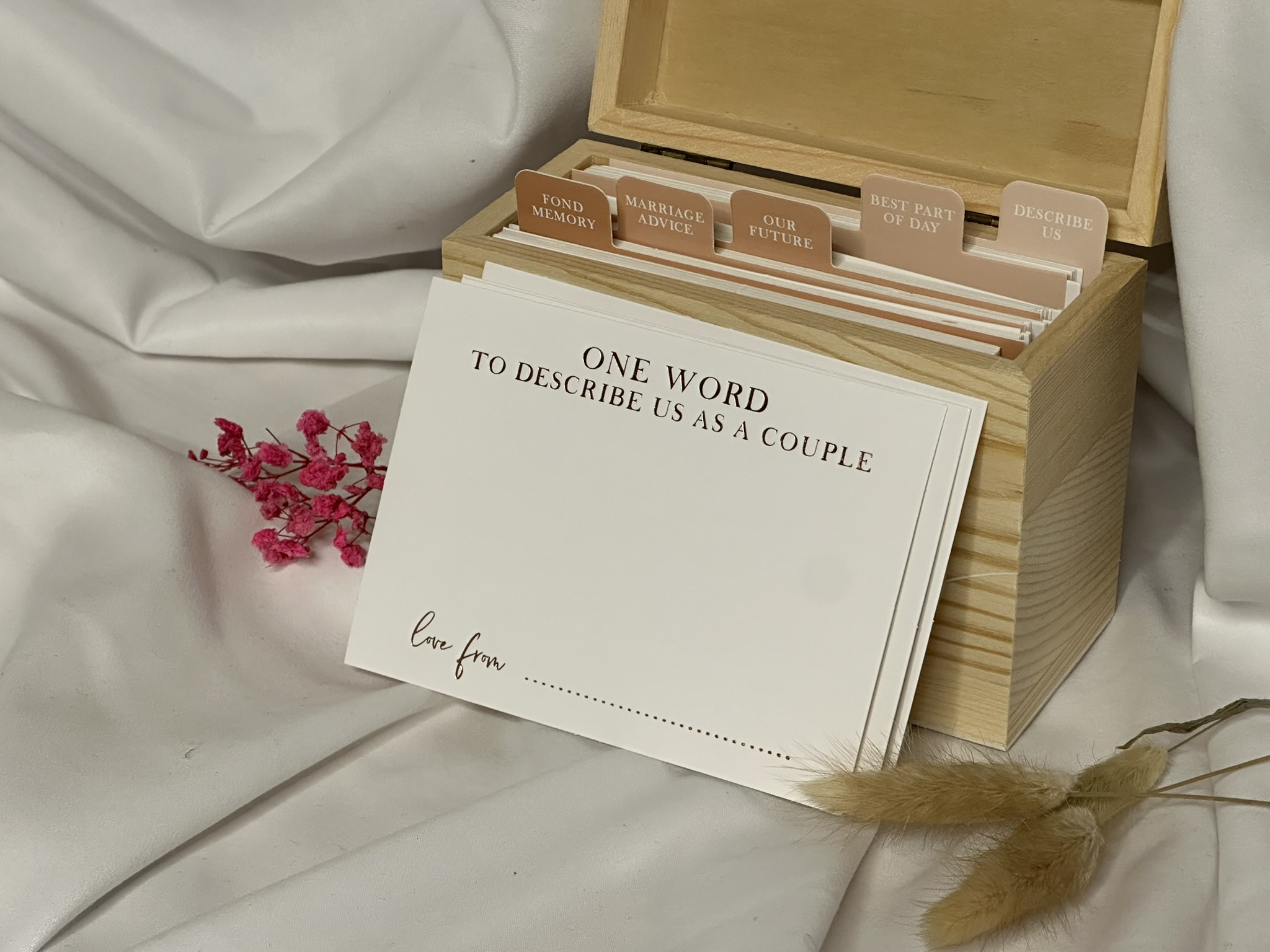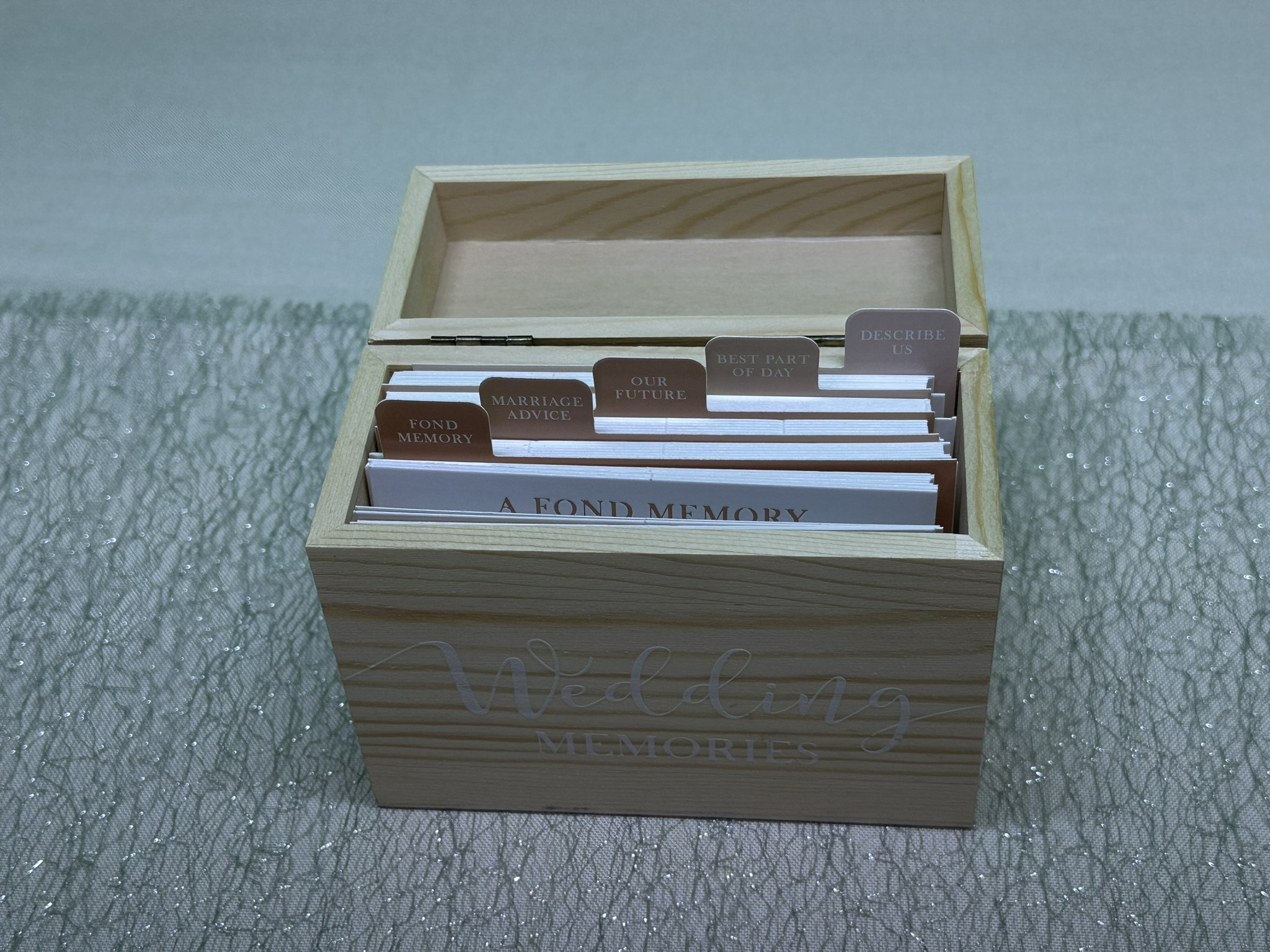 Bewahren Sie wertvolle Erinnerungen und Botschaften mit der Wedding Memory Box. Diese Holzbox enthält 75 Karten, aufgeteilt in 5 Abschnitte mit Fragen, die Gäste ausfüllen können. Eine stilvolle und originelle Möglichkeit, ein bleibendes Andenken an Ihren Hochzeitstag zu schaffen, gefüllt mit persönlichen Worten und Ratschlägen von Freunden und Familie.