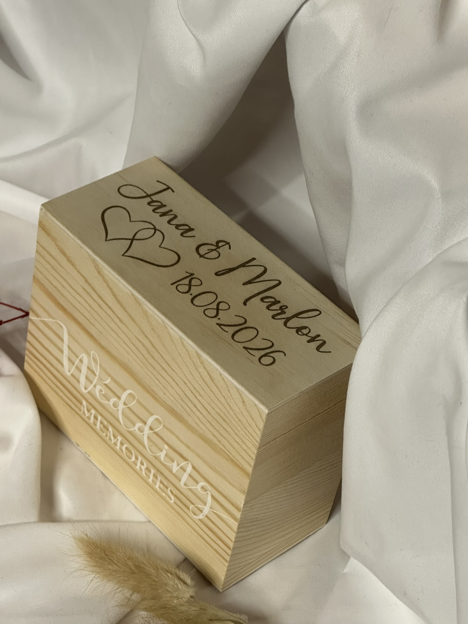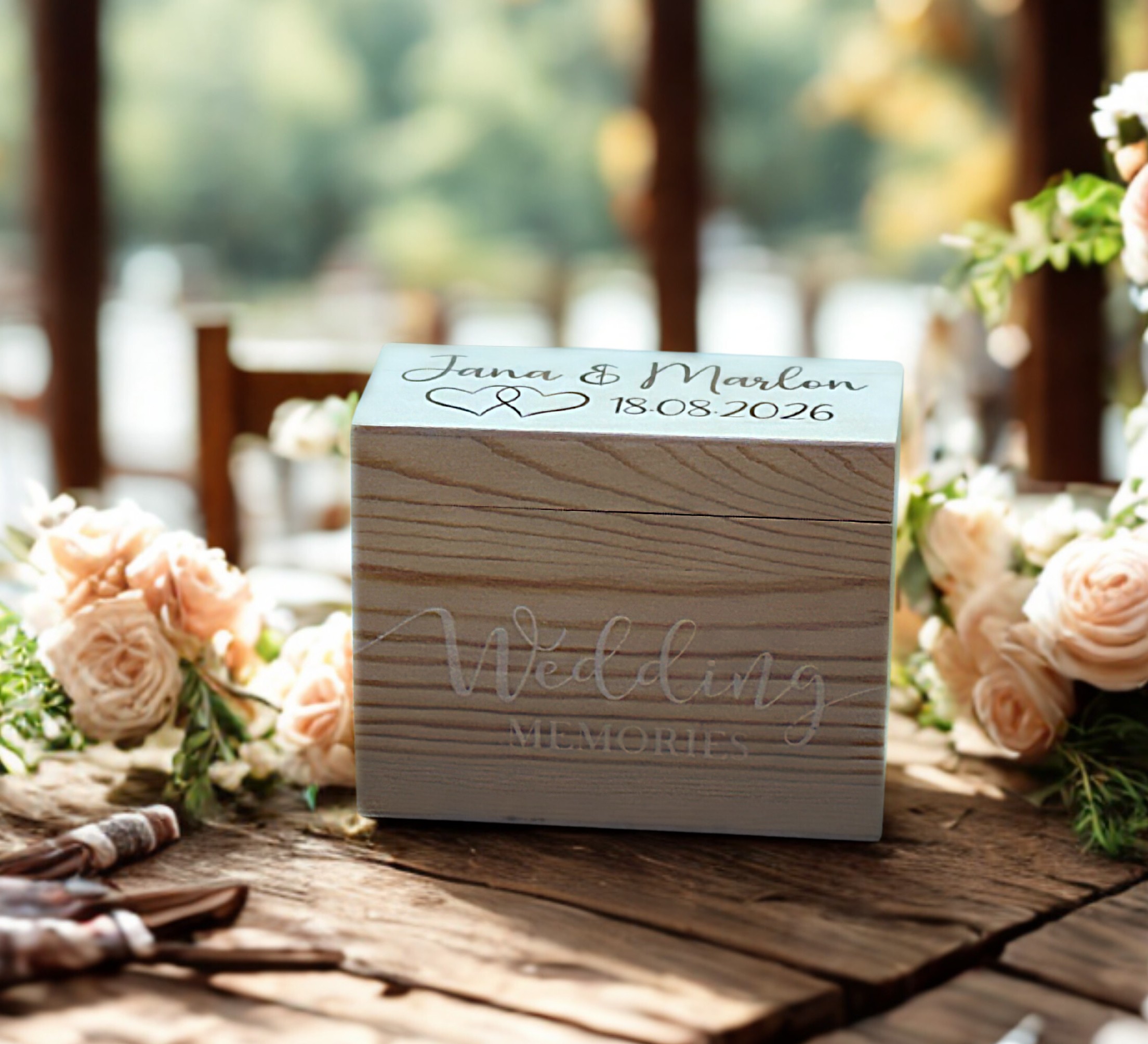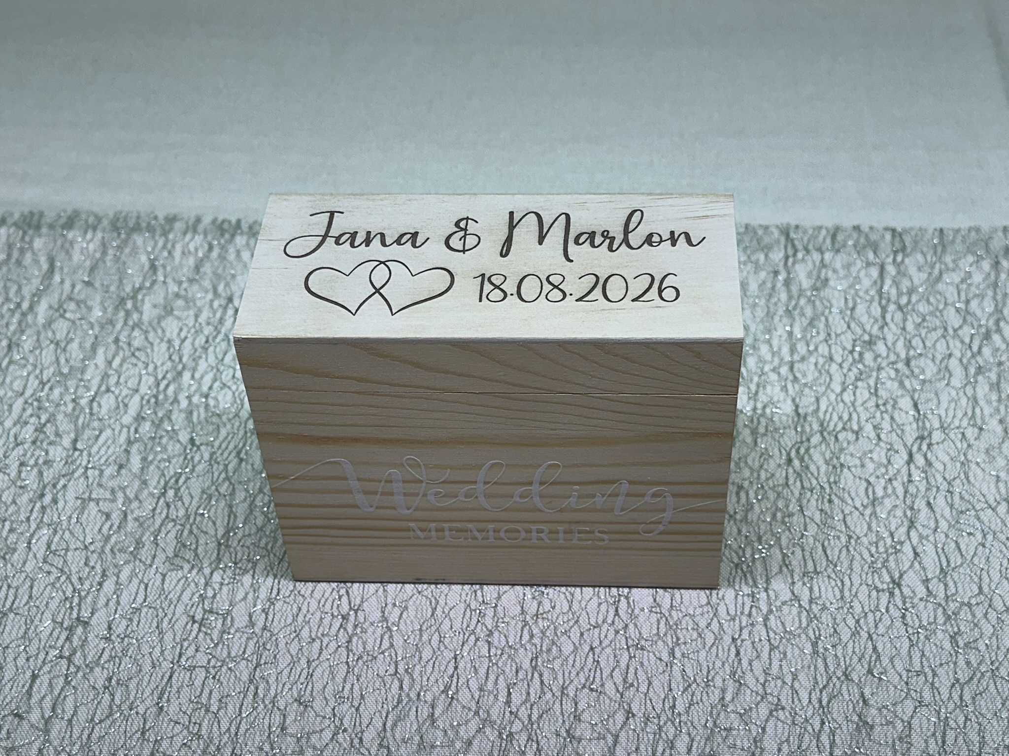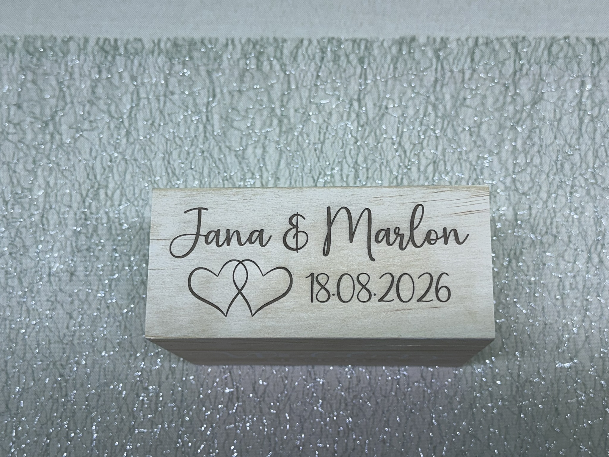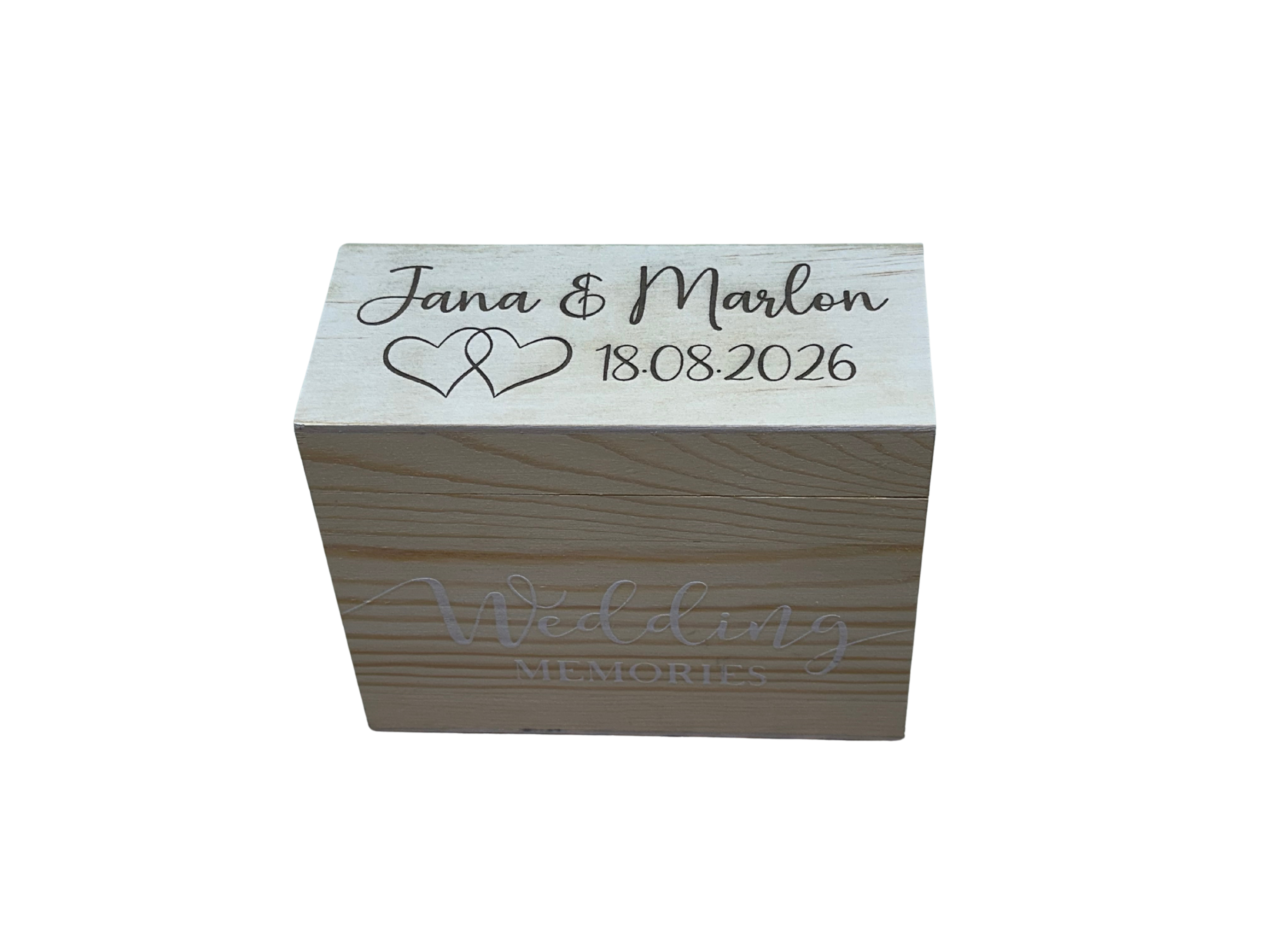 Wir personalisieren die Box mit den Namen und dem Hochzeitsdatum.