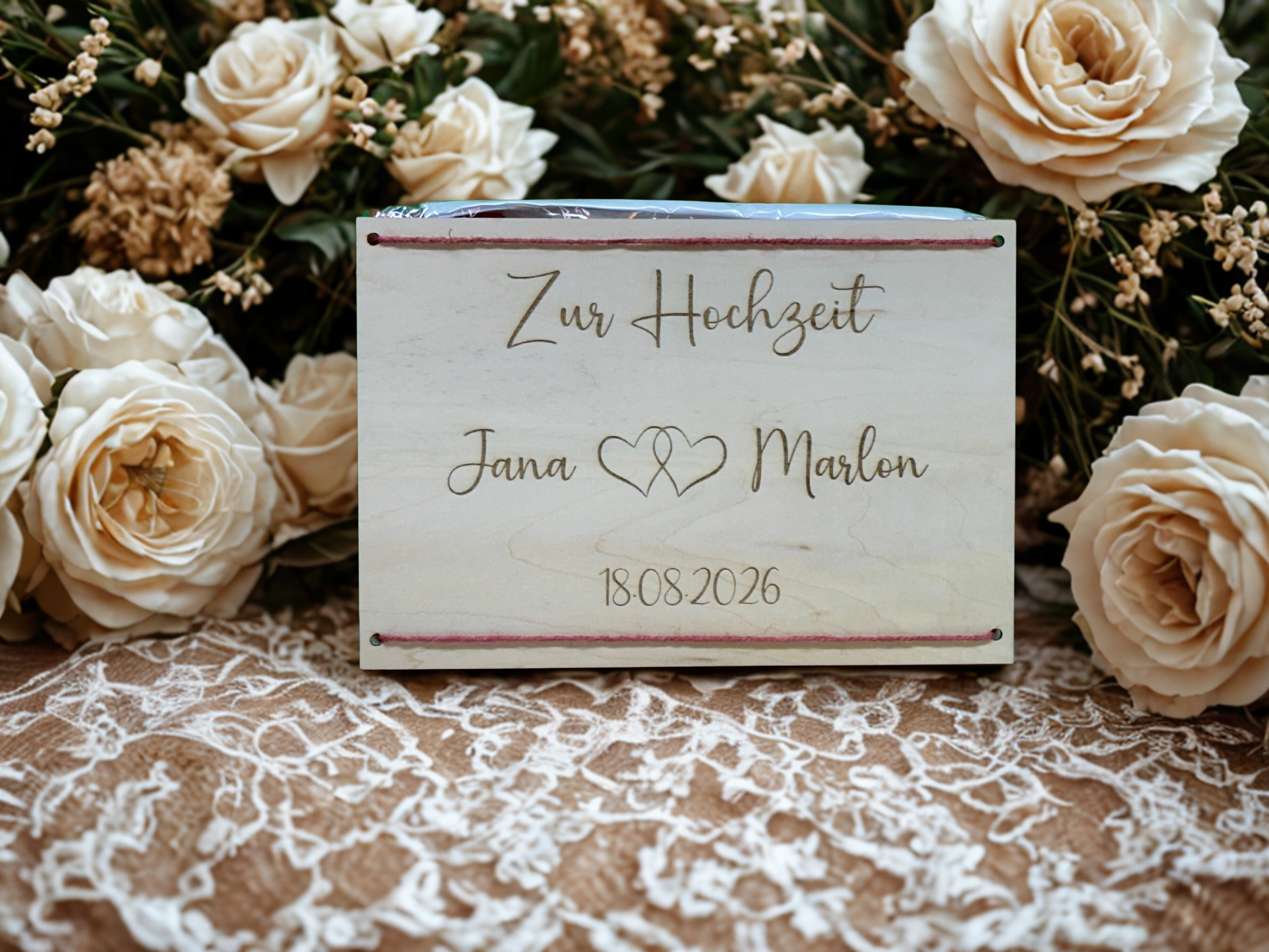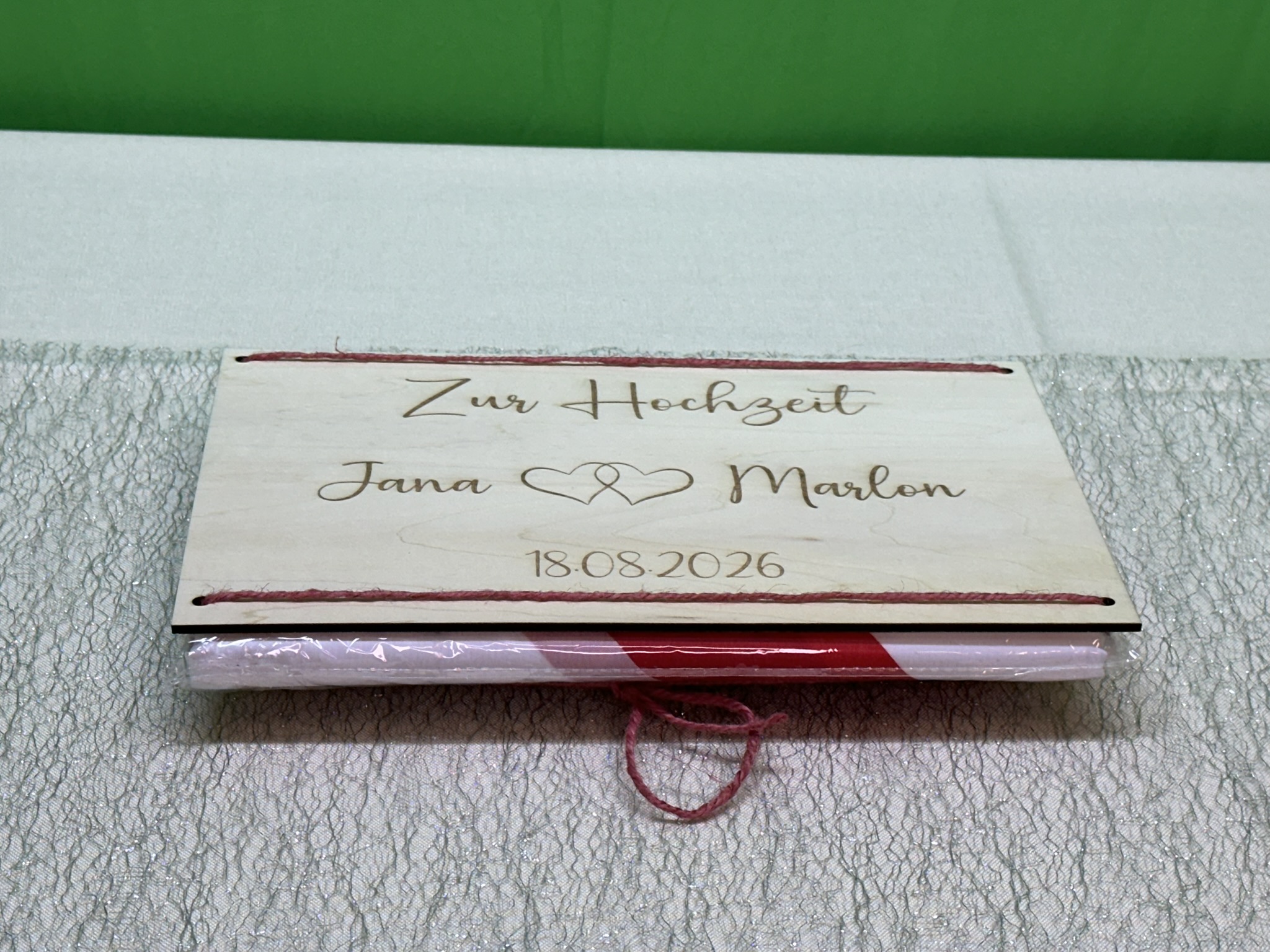 Es ist ein komplettes 5-teiliges Set mit 1 Polyesterlaken von ca. 200 cm, 2 Stiften und 2 Scheren und eine Holztafel mit den Namen des Brautpaaren und das Hochzeitsdatum. An diesem Brett kann das ausgeschnittene Herz dann auch befestigt werden um es aufzubewahren.