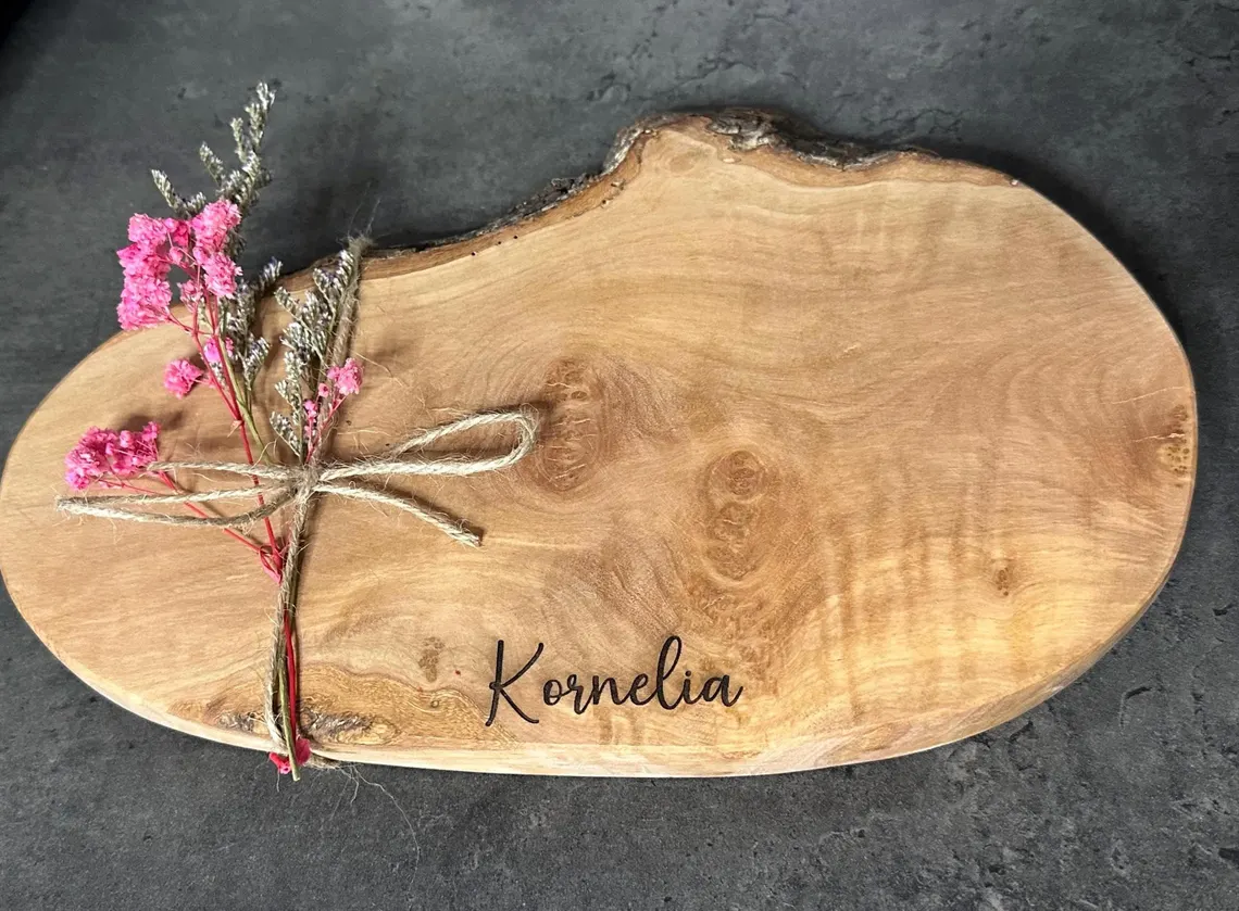 Wenn Sie auf der Suche nach einem besonderen Geschenk sind, liegen Sie mit diesem Schneidebrett genau richtig. Das Brettchen mit wunderschöner Maserung wird mittels Laser mit dem Namen versehen.