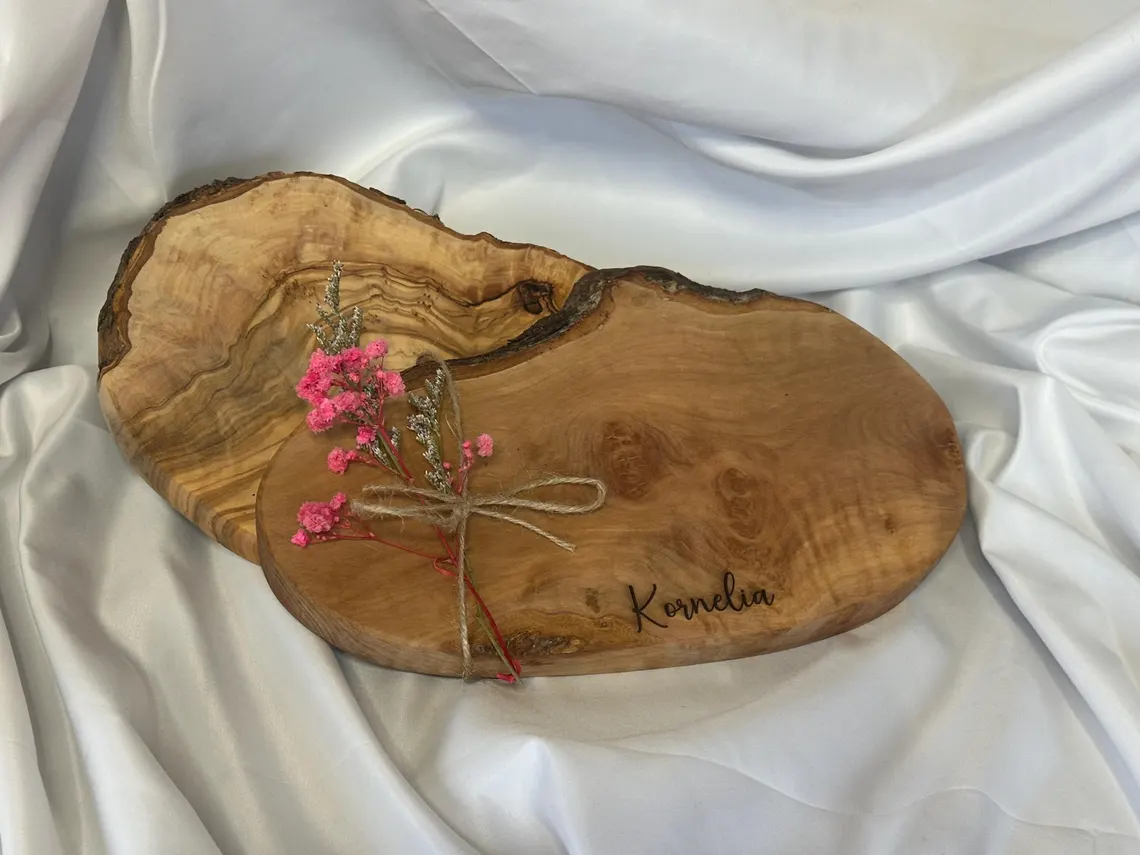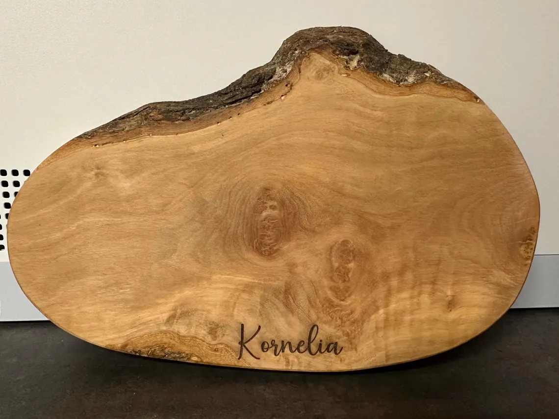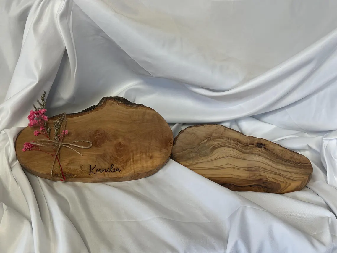 Schneidebrett aus Olivenholz mit Name / Brettchen Olive / Naturform