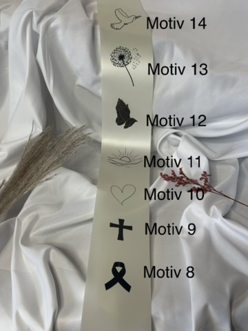 Wir bieten Ihnen schöne Trauerschleifen in den Farben Creme, Schilf oder Grau an.